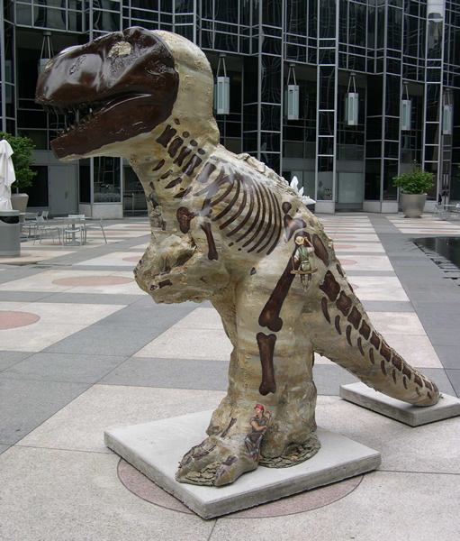 "I was very excited about this competition as I have had great experiences with Public Art Projects in the past," I've been adopted!says artist Glennis McClellan. "Also, my nephew loves Dinosaurs and thinks I am the coolest aunt ever!" Ms. McClellan added, "It did require some fiberglass detail from Mr. Digsculpture work to create the rock-like texture in some areas, but the overall T. rex shape was maintained and it was painted to resemble stone. I also used real rocks at the base of the statue, so it would seem that some actual diggin' had been going on - that was a last-minute decision that really added to the overall design."